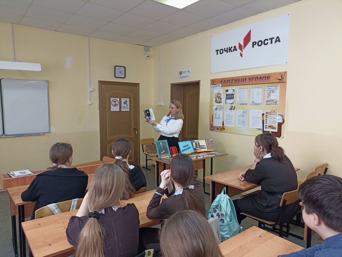 Ведущие Светлана Михеева и Мария Пименова познакомили ребят с интересными фактами из жизни писателя, представив им презентацию о его творческом пути. Провели обзор литературы по книжной выставке «Слово мое звучало недаром».